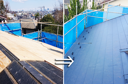 外壁、屋根、フェンスをリフォームしました。屋根の葺き替えを行う場合、屋根だけではなくその下にある防水シートも交換するため、屋根材が長く保たれます。また、軽く優れた屋根材は、地震発生時の倒壊のリスクも減少します。 |